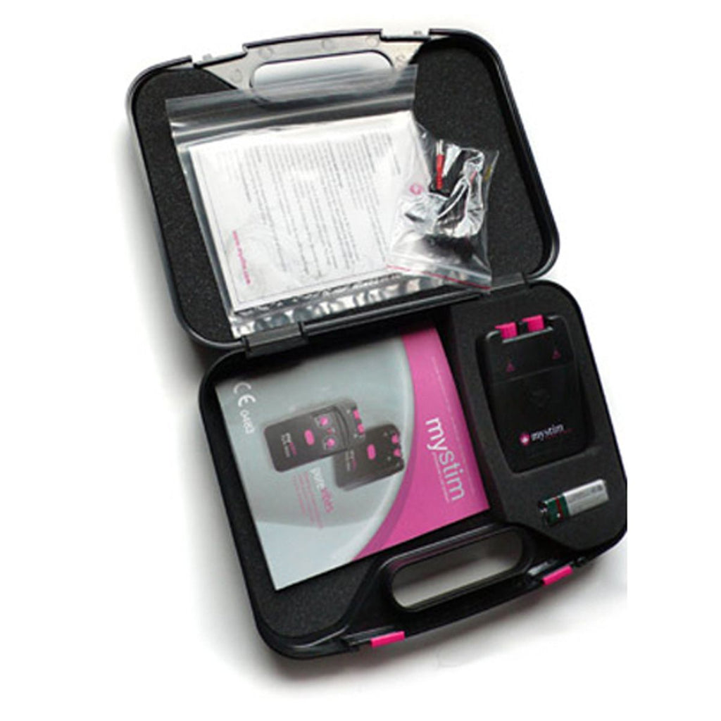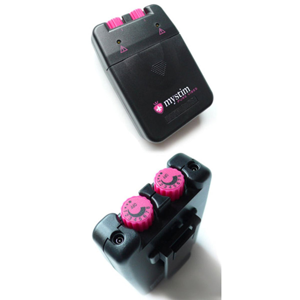 Mystim Pure Vibes - analog e-stim TENS unit With Mystim to new heights... By means of soft electrical impulse you can stimulate or heavily excite almost every area of your body. However you like! Enjoy the undescribeable comforting trickling sensation that spreads over your entire body and will lead you to a new dimension of satisfaction. ... as vibrating was yesterday! Discover your last anew and experiment with this love toy of the latest Generation, that can lead you also to never suspected heights. product information: 2 individually adjustable channels 3 different programs for the satisfaction of individual wants, from affectionate to intensive up to hard intensity, pulse width and pulse rate are arbitrary for the user plug can be rotated 360 degrees, which prevents a cable break including a flexible belt clip certified according to the medical device law with CE 0483 scope of delivery: 1 analog Mystim stimulation current device 1 solid plastic suit case 4 self-adhesive electrodes 2 wires for self-adhesive electrodes 1 battery 9 1 instruction manual in English, German and French Technical Data: asymmetrical bi-phasic square pulse Intensity: 0 - 80 mA Frequency: 2 - 150 Hz Impulse width: 30 - 260 µs Weight: 110g including battery Measures: 95 x 65 x 25 mm (l x b x h) Battery: 9V battery