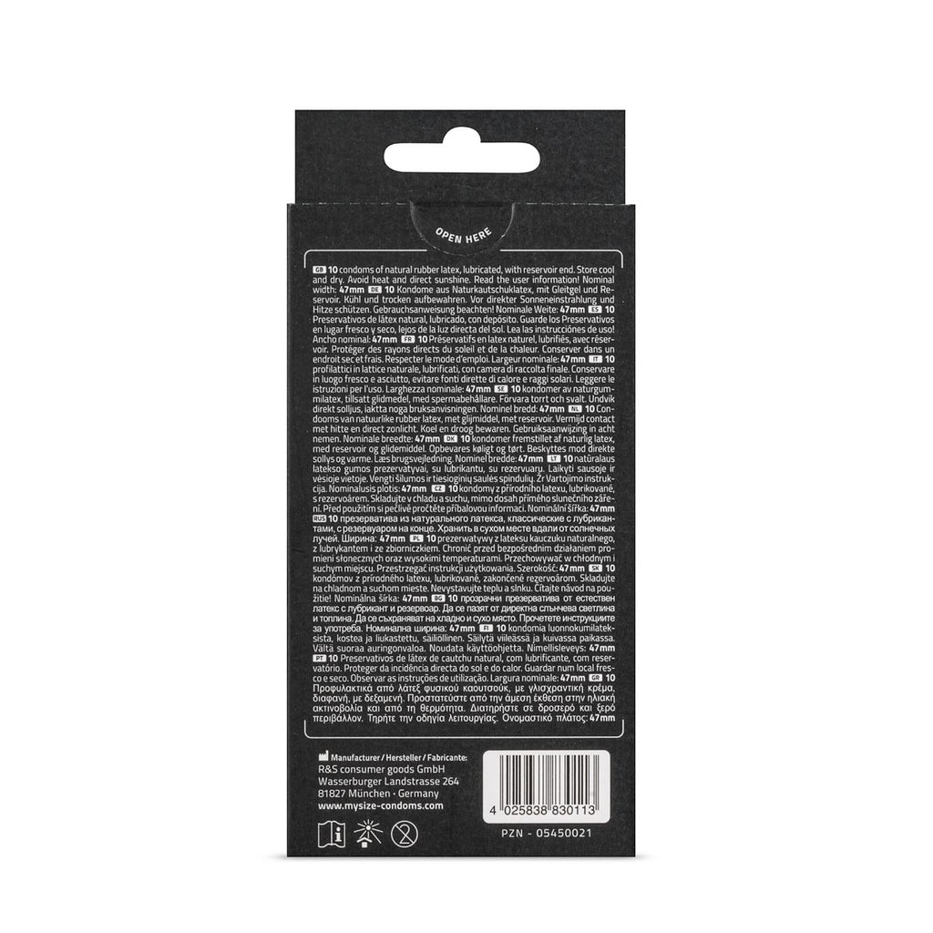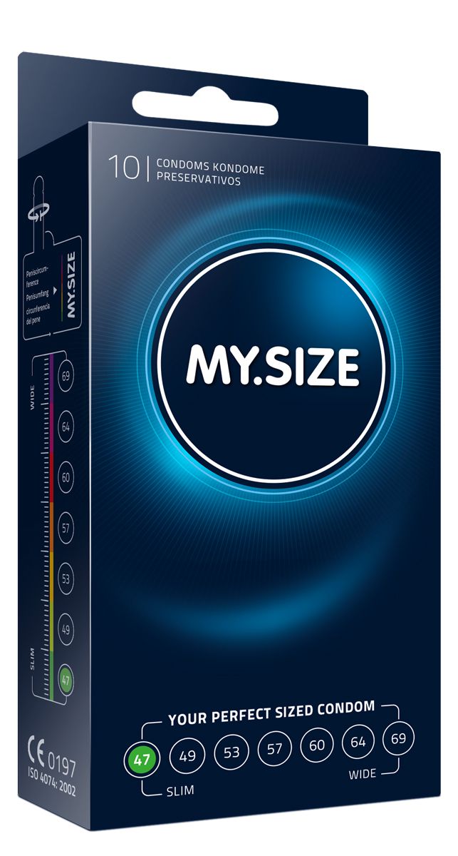 The condoms from the German brand MySize are made in various sizes, so you can always find a perfectly fitting condom. Wearing a properly fitting condom is not only more pleasant, but also increases safety during use. These condoms with a width of 47 mm avarage condoms with the following dimensions: Nominal width: 47 mm For penile circumference: 9.5 - 9.9 cm Length: 160 mm Condom Features: Taste: Neutral Lubricant: Normal Color: Transparent Texture: Smooth Size: Smaller Nominal width: 47 mm Thickness: Normal Number pieces in packaging: 10 Brand: MySize