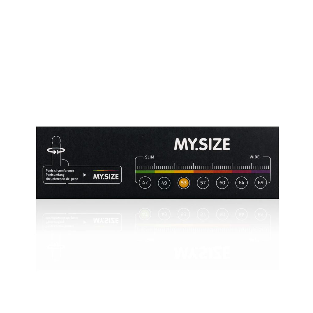 The condoms from the German brand MySize are made in various sizes, so you can always find a perfectly fitting condom. Wearing a properly fitting condom is not only more pleasant, but also increases safety during use. These condoms with a width of 53 mm avarage condoms with the following dimensions: Nominal width: 53 mm For penile circumference: 11-11.4 cm Length: 180 mm Condom Features: Taste: Neutral Lubricant: Normal Color: Transparent Texture: Smooth Size: Avarage Nominal width: 53 mm Thickness: Normal Number pieces in packaging: 36 Brand: MySize