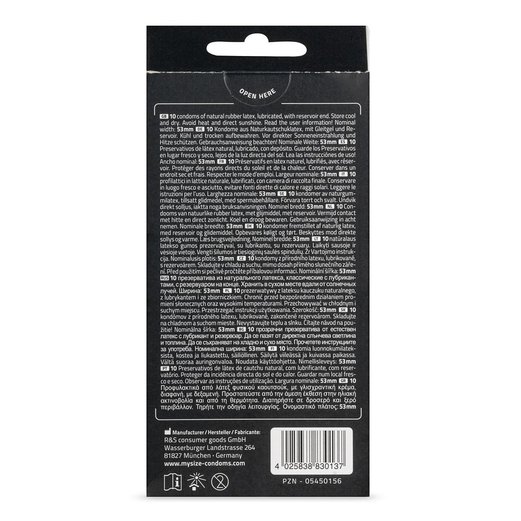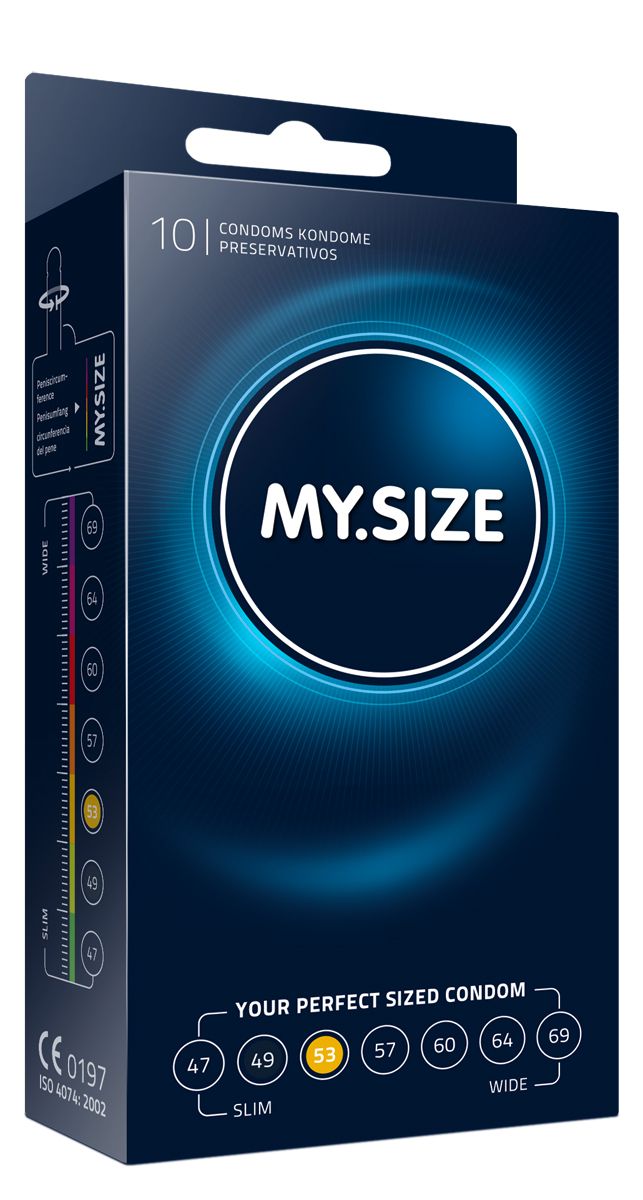 The condoms from the German brand MySize are made in various sizes, so you can always find a perfectly fitting condom. Wearing a properly fitting condom is not only more pleasant, but also increases safety during use. These condoms with a width of 53 mm avarage condoms with the following dimensions: Nominal width: 53 mm For penile circumference: 11-11.4 cm Length: 180 mm Condom Features: Taste: Neutral Lubricant: Normal Color: Transparent Texture: Smooth Size: Avarage Nominal width: 53 mm Thickness: Normal Number pieces in packaging: 10 Brand: MySize