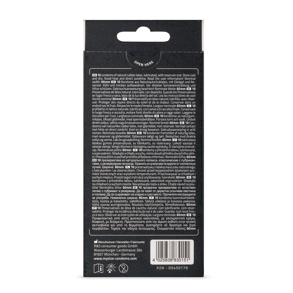The condoms from the German brand MySize are made in various sizes, so you can always find a perfectly fitting condom. Wearing a properly fitting condom is not only more pleasant, but also increases safety during use. These condoms with a width of 60 mm wider XL condoms with the following dimensions: Nominal width: 60 mm For penile circumference: 12- 12.9 cm Length: 195 mm Condom Features: Taste: Neutral Lubricant: Normal Color: Transparent Texture: Smooth Size: larger XL Thickness: Normal Number pieces in packaging: 10 Brand: MySize