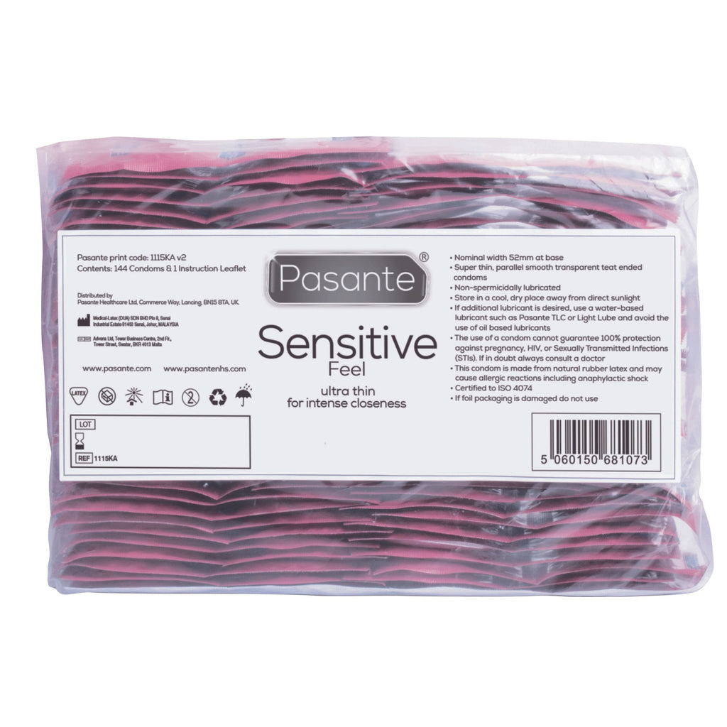 The Pasante Sensitive Condom is thinner than most standard condoms. Due to the good thermal conductivity you feel the same intense and exciting experience, as when you are not wearing a condom. The transparent condoms are made of natural latex and lubricated and reservoir. features: - Taste: Neutral - Lubricant: Normal - Color: Transparent - Structure: Smooth - Size: Medium - Nominal width: 52 mm - Thickness: Ultra Thin - Package quantity: 144 pcs - Brand: Pasante Recommended for: In general every tested condom is safe for vaginal, oral and anal contact, as long as the fit is good and there is enough lubricant.