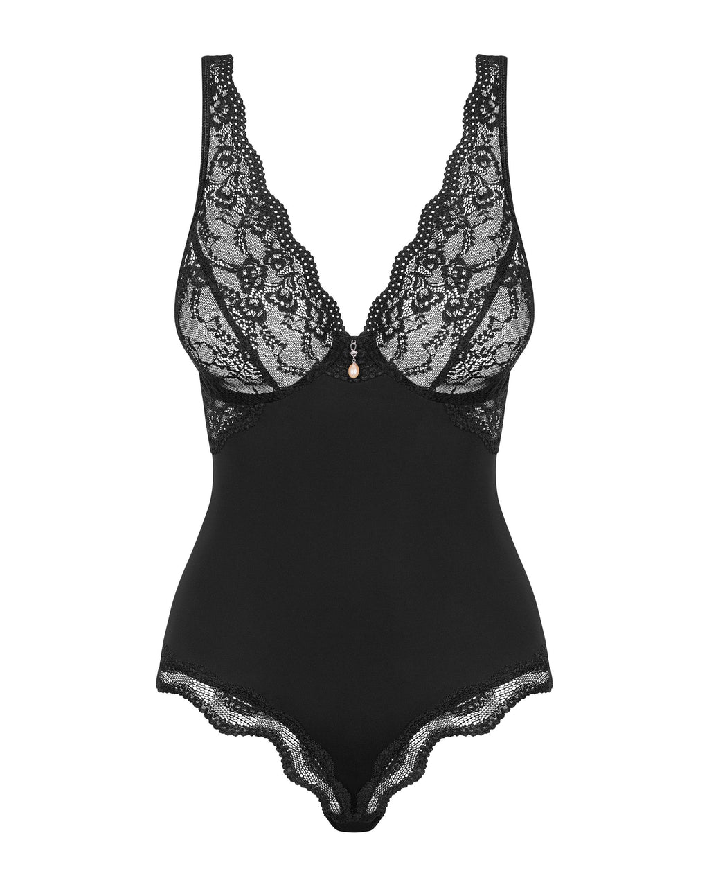 Sexy bodysuit with lace, underwire cups, and adjustable shoulder straps.