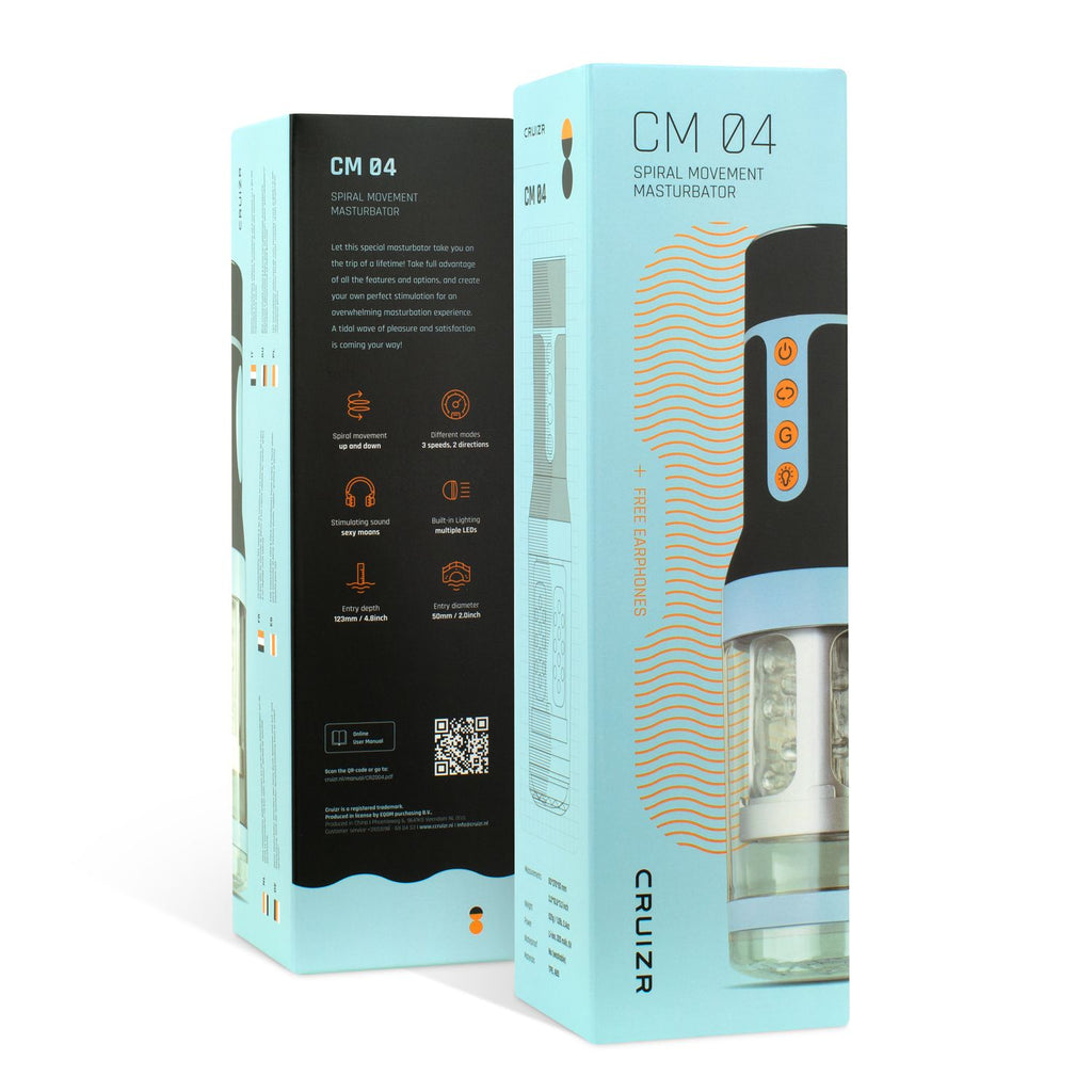 The CRUIZR CM04 masturbator is a discrete penis stimulator that features a rotating, spiraling motion. You can choose from 3 speeds and have the rotating feature turn both left and right. Twist the cap off the top and discover the soft, flexible vaginal opening. The sleeve has a studded and ribbed interior and feels lifelike. It's removable and easy to clean. The CM04 is easy to operate and features a high-end design. It quickly recharges with the included USB cable. Use water-based lubricant for a comfortable feeling. Please note: the CRUIZR CM04 is splash-proof. Clean the sleeve with toy cleaner and let it dry completely before putting it back.