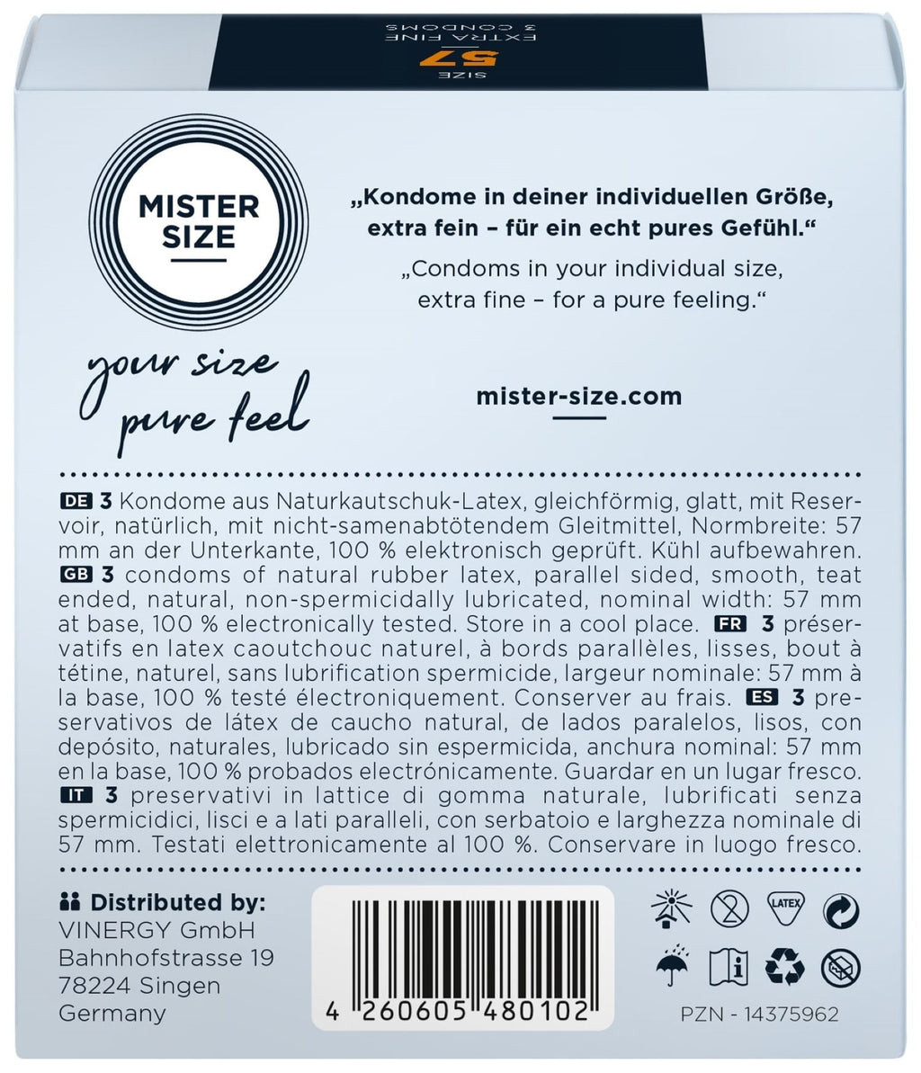 The condoms of the German brand Mister Size come in different sizes, so there's always one that fits you perfectly. These 57 mm wide condoms are wider and feature the following dimensions: Nominal width: 5.7 mm For up to 11.5 to 11.9 cm in penis circumference For up to 4 cm in penis diameter Length: 18 cm Condom Features Taste: neutral Lubricant: normal Color: clear Texture: smooth Condom thickness: ultra thin Number per package: 3 Ingredients: Aqua, Hydroxyethylcellulose, Citric Acid, Glycerin, Potassium Sorbate, Sodium Benzoate.