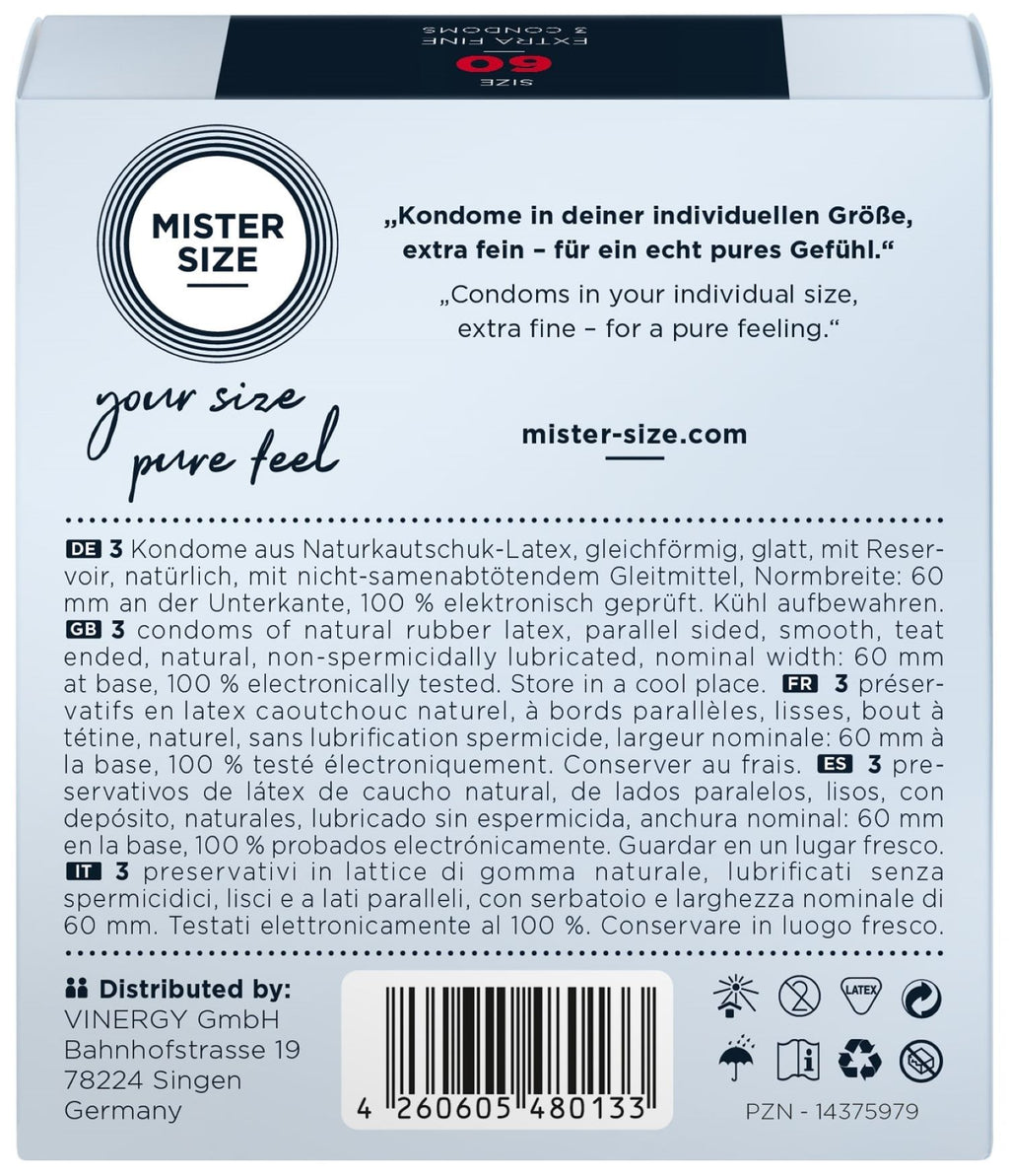 The condoms of the German brand Mister Size come in different sizes, so there's always one that perfectly fits you. These 60 mm wide condoms are wider and feature the following dimensions: Nominal width: 6 mm For up to 12 - 12.9 cm in penis circumference Length: 19.5 cm Condom Features Taste: neutral Lubricant: normal Color: clear Texture: smooth Thickness: ultra thin Quantity per package: 3 Ingredients: Aqua, Hydroxyethylcellulose, Citric Acid, Glycerin, Potassium Sorbate, Sodium Benzoate.