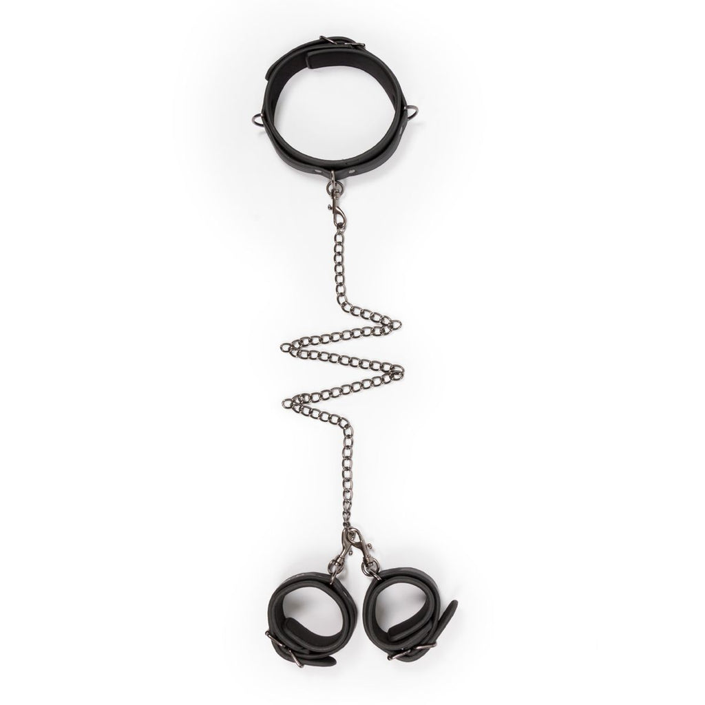 You are in control when your sub is wearing this fantastic bondage set! It consists of a collar with hand cuffs that can easily be detached from each other using the clip fasteners. The toys are made of sturdy faux leather lined with foam, which makes them durable and comfortable to wear. The collar is adjustable from 45 to 58cm and the cuffs are adjustable from 11 to 28cm. The chain has a length of 40cm. Combine this special set with other toys, such as ankle cuffs, ball gags, paddles and nipple clamps for an extra exciting experience.