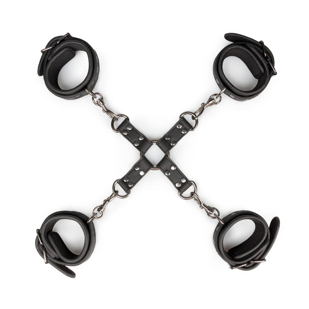 Complete your bondage game with this fun set! The set consists of handcuffs, ankle cuffs and a hogtie that can be used anyway you want. The cuffs are attached to the hogtie with clip fasteners, so you can easily detach them and use them separately or attach them to other bondage toys, such as harnesses or collars. The cuffs and hogtie are made of sturdy faux leather and metal and very durable. The cuffs are adjustable for a perfect fit and lined with foam for a comfortable use.