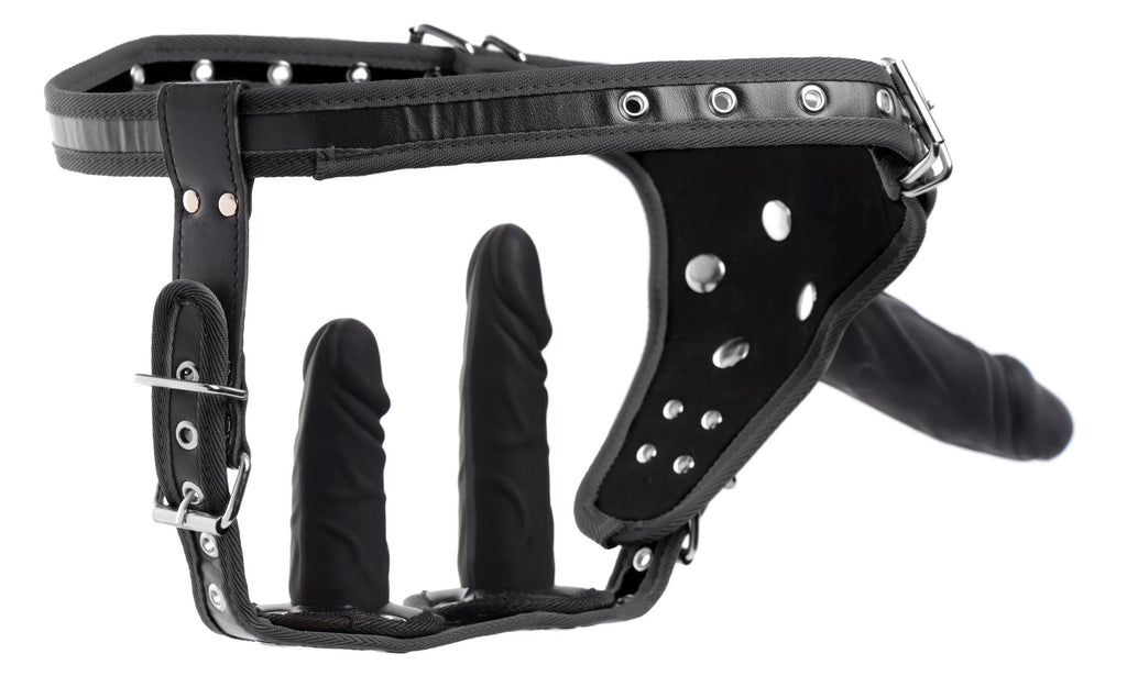 Make your wildest dreams come true and choose this exciting pegging set! The uniqueness of this sexy harness is that both wearer and recipient can optimally enjoy delicious stimulation. The harness comes with 3 silicone dildos in different sizes and these are interchangeable so you can try out multiple combinations. You can choose to use only 1 dildo or all 3 at the same time. This allows the wearer to experience anal and vaginal stimulation while penetrating her partner with the 3rd dildo. The harness is fully adjustable and suitable for a waist circumference between 63 and 104 cm. The part that runs between the legs is adjustable between 50 and 58 cm. The material is PU leather and the metal details are nickel free. The 3 dildos are made of soft silicone and flexible enough for a comfortable feel. The dimensions are: -S entry depth 9.5 cm, maximum diameter 3.5 cm -M entry depth 12.7 cm, maximum diameter 3.5 cm -L entry depth 17 cm, maximum diameter 4 cm After use, clean the dildos with lukewarm water and a toy cleaner and pat dry with a lint-free cloth.