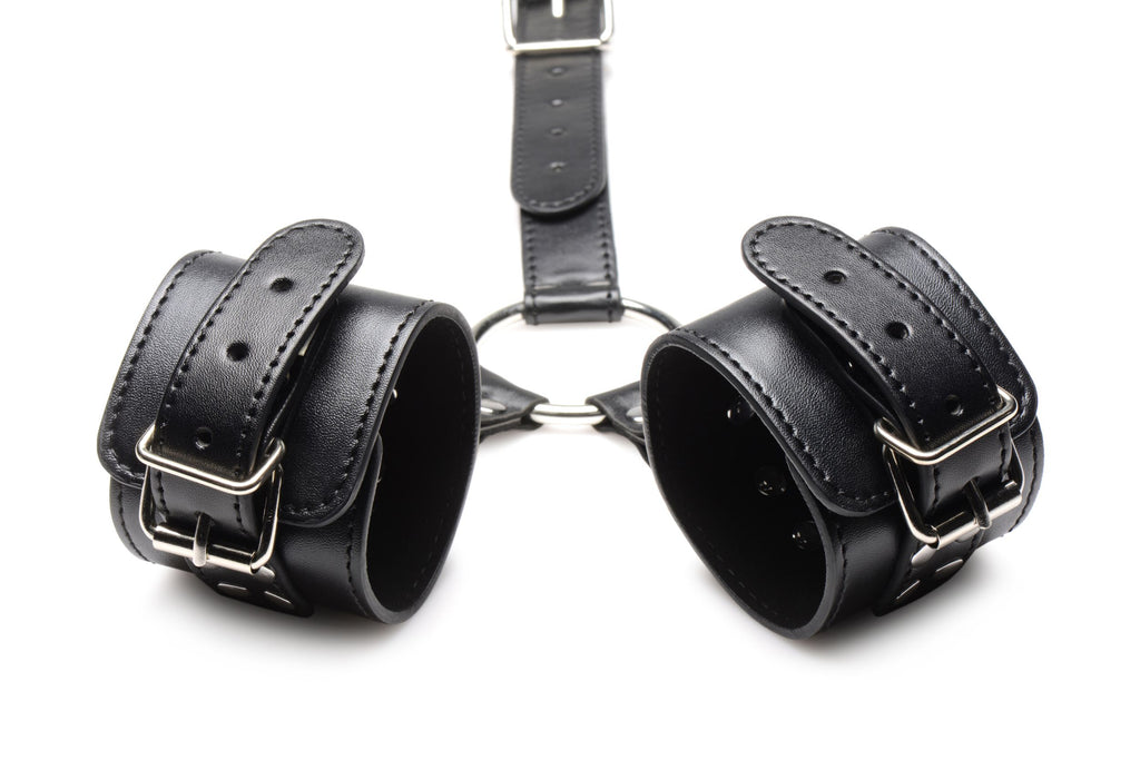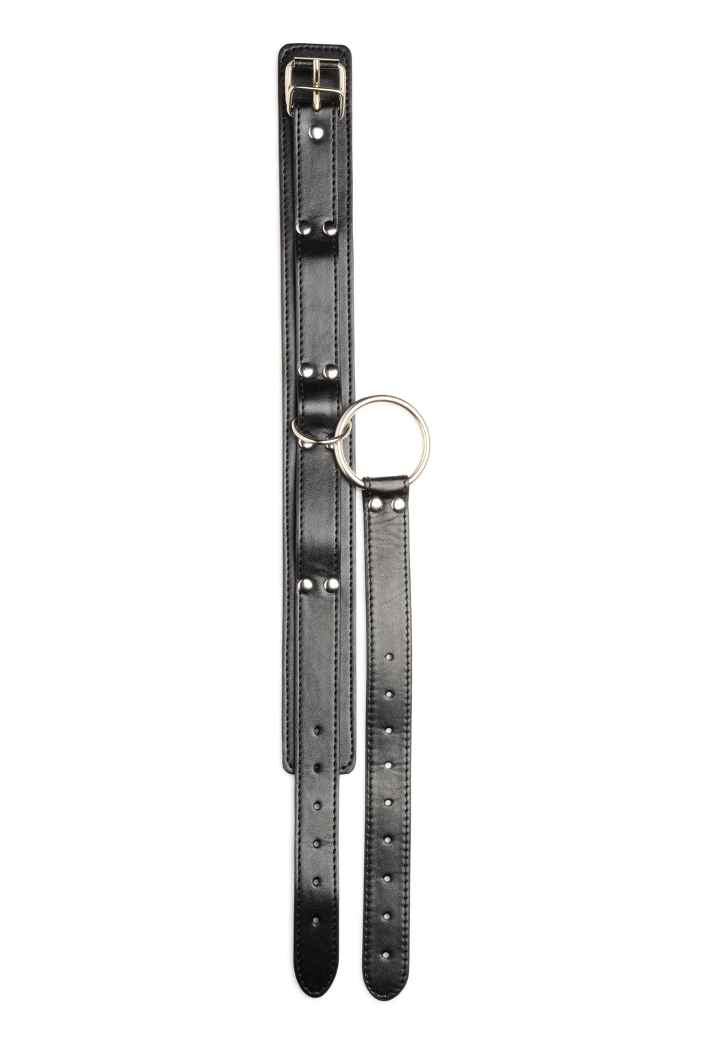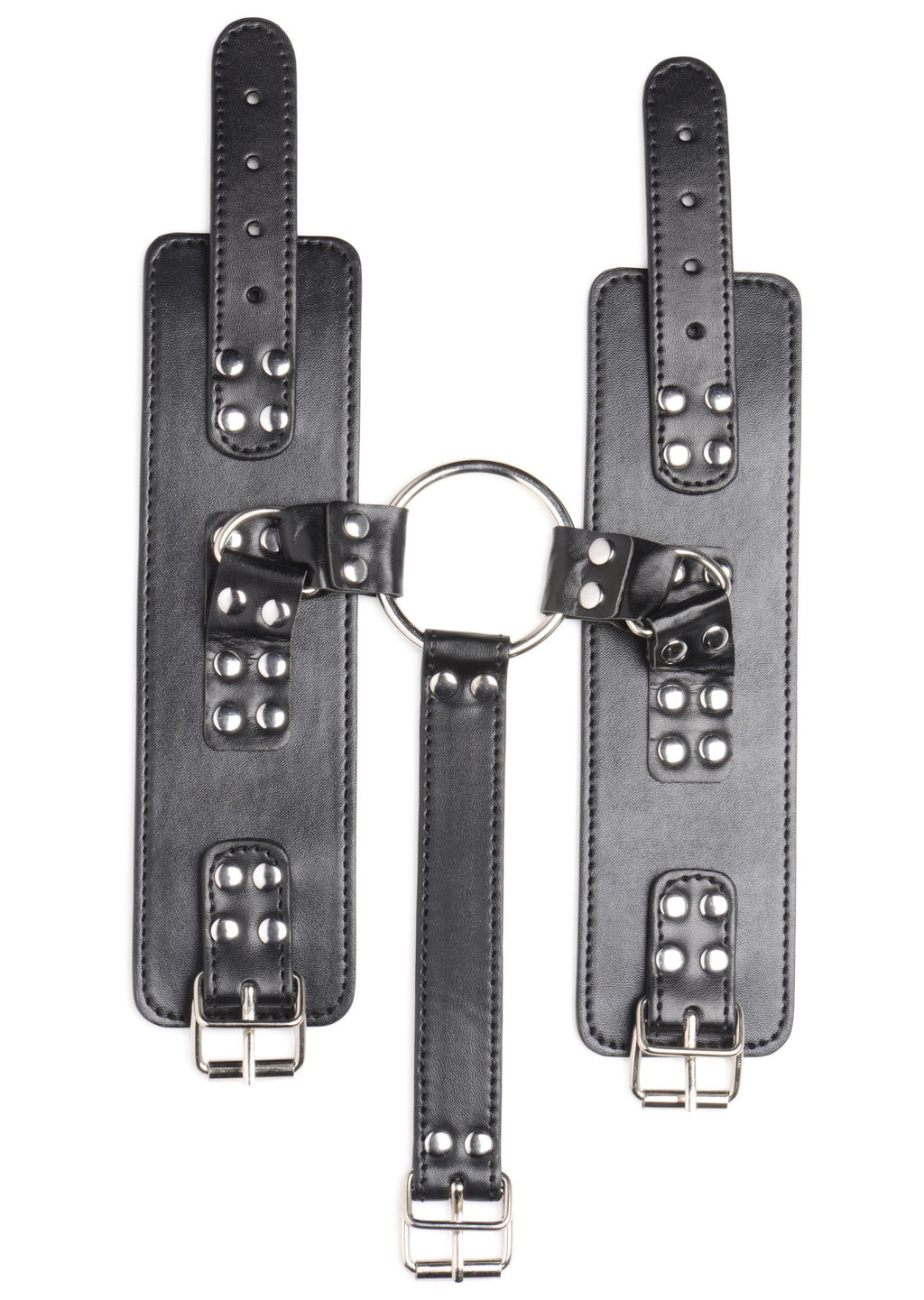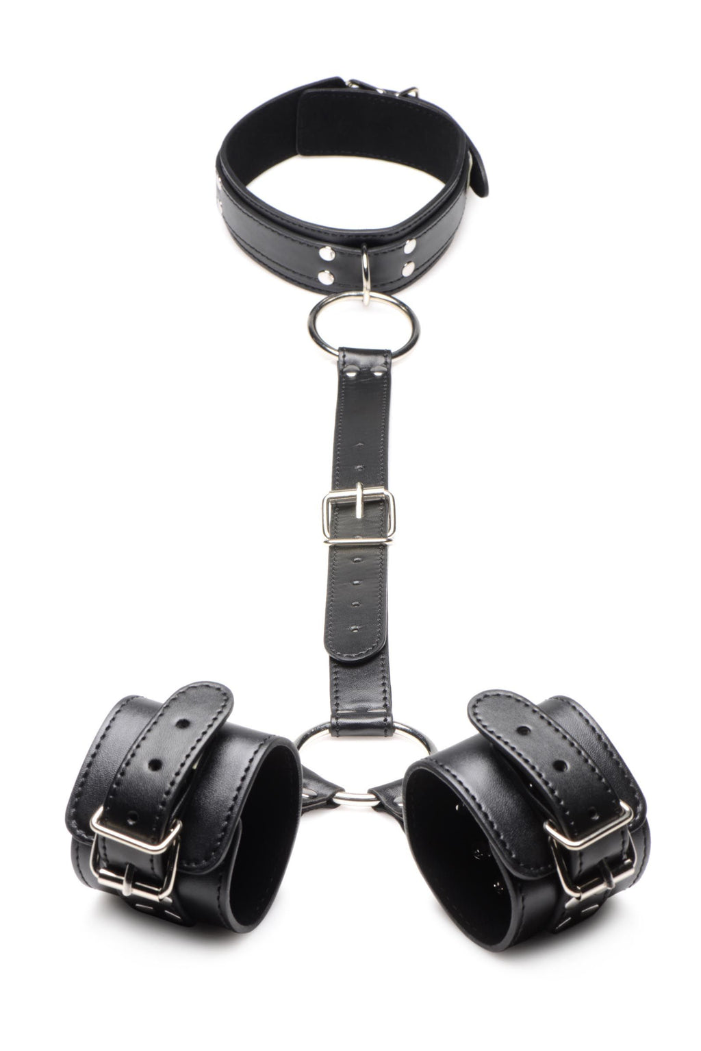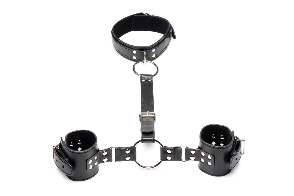 Tie up your sub with these neck-to-wrist cuffs! The soft inner lining is gentle on the skin for optimal comfort in any position The vegan PU-leather is easy to clean and retains the sexy, classic leather look. The large O-rings are made of strong, nickel-free metal and can be fitted with bondage ropes, chains and other BDSM products. The whole set is widely adjustable for the perfect fit on any body. The collar has a width of 3.8 cm and is adjustable between 32 and 42 cm. The wrist cuffs have a width of 6 cm and are adjustable between 19 and 25 cm. The back strap is adjustable between 26.5 and 42 cm.