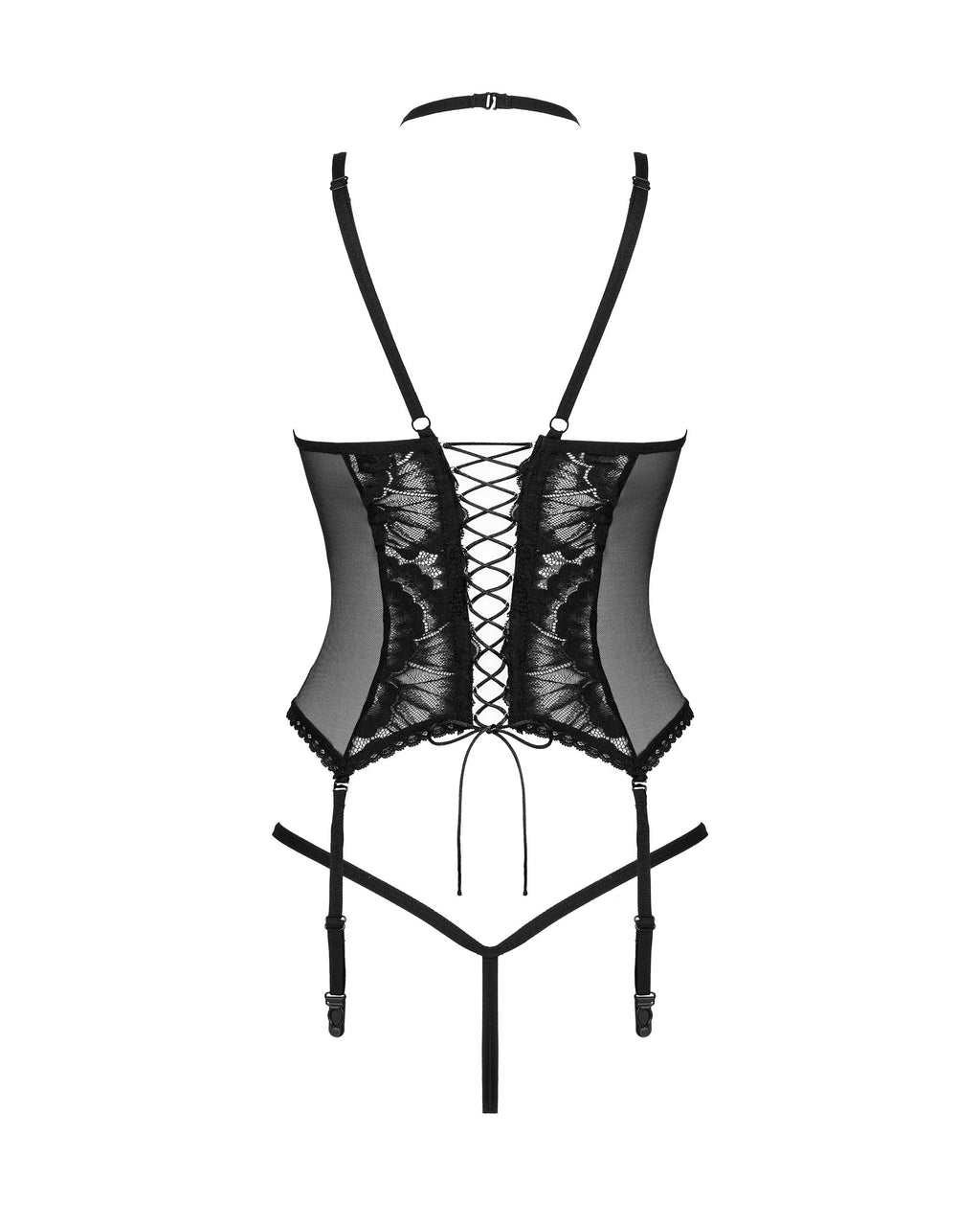 An elegant set with a very seductive look. Made of luxurious lace and finished with fine details. With supportive underwired cups for a great fit and cleavage. Elastic lace and lacing at back. Includes thong shown, excludes stockings.