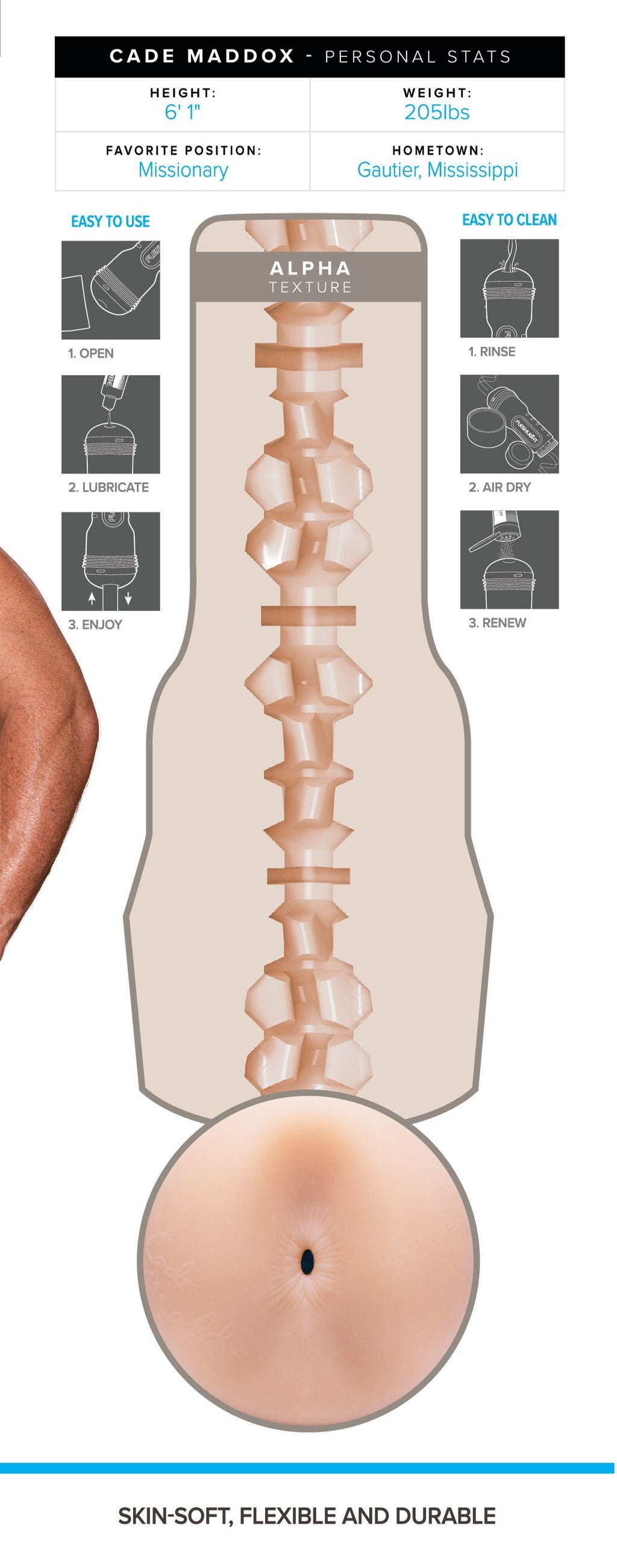 Get pampered by Cade Maddox, a delicious masturbator with anus opening modeled after the famous porn star. Known for its discreet design, the Fleshjack Boys series lives up to its name. The removable sleeve is made of SuperSkin, a body-safe silicone that feels tremendously soft and comfortable. This material quickly warms up, which is a major advantage. The inside features nubs and ridges and the different "chambers" each have their own texture. The cap on the backside allows you to set the desired vacuum. The overall combination provides a very realistic, intense feeling and provides a wonderful experience. The opening is flexible and completely adjusts to the size of your penis. The plastic case ensures a firm grip on the masturbator. The sleeve is easy to clean which makes the Fleshjack the perfect toy for infinite pleasure. Tips to enjoy your Fleshjack even longer! -Remove the sleeve from the hard cover after use and clean it thoroughly with lukewarm water and an antibacterial soap or a toy cleaner. -Always let the sleeve thoroughly dry in a dust-free area before putting it back in the case. -Use Fleshlight maintenance powder to best protect the silicone. -Only use a water-based lubricant. A silicone-based lubricant could damage the materia