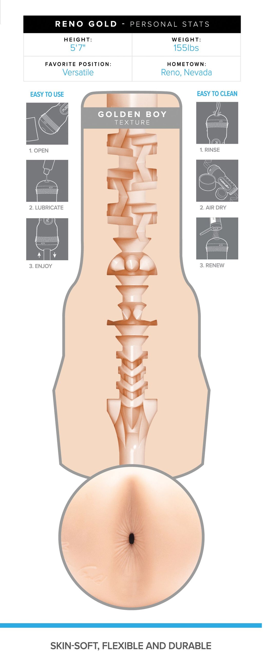 Get pampered by Reno Gold, a delicious masturbator with anus opening modeled after the famous porn star. Known for its discreet design, the Fleshjack Boys series lives up to its name. The removable sleeve is made of SuperSkin, a body-safe silicone that feels tremendously soft and comfortable. This material quickly warms up, which is a major advantage. The inside features nubs and ridges and the different "chambers" each have their own texture. The cap on the backside allows you to set the desired vacuum. The overall combination provides a very realistic, intense feeling and provides a wonderful experience. The opening is flexible and completely adjusts to the size of your penis. The plastic case ensures a firm grip on the masturbator. The sleeve is easy to clean which makes the Fleshjack the perfect toy for infinite pleasure. Tips to enjoy your Fleshjack even longer! -After use remove the sleeve from the hard cover and clean it thoroughly with lukewarm water and an antibacterial soap or toy cleaner. -Always let the sleeve thoroughly dry in a dust-free area before putting it back in the case. -Use Fleshlight maintenance powder to best protect the silicone. -Only use a water-based lubricant. A silicone-based lubricant could damage the material.